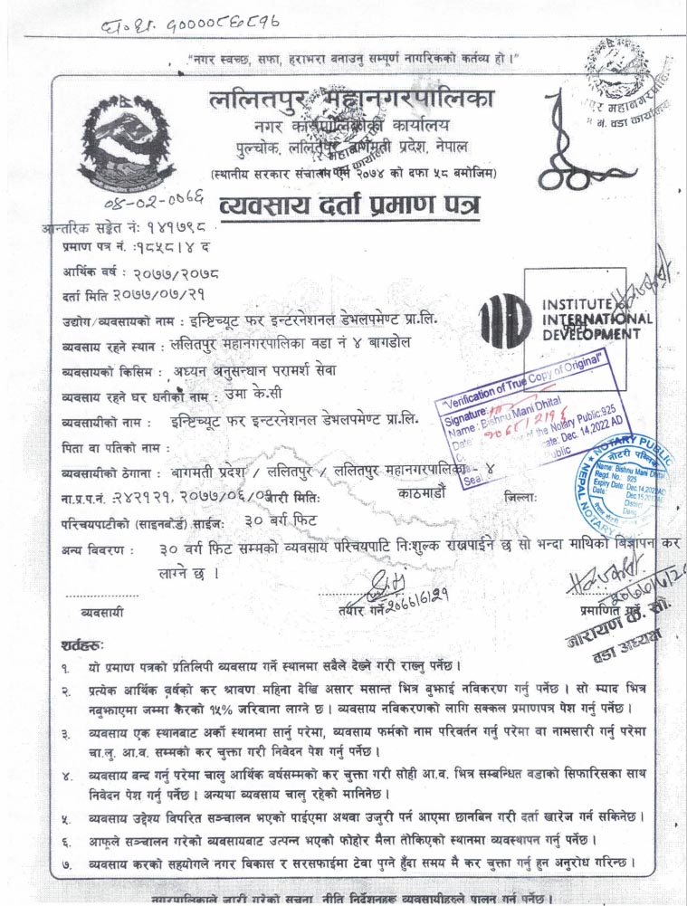 We at the Institute for International Development envision a prosperous and equal world. We believe that such a world is possible when policymakers make an effort to devise and implement result-oriented policies. We support policymakers, government agencies, development partners, businesses, and other stakeholders in taking rigorous approaches to the policy cycle. We provide critical research and insights, training, and consulting services on various themes. We serve as ‘Policy Think Tank Institute’ for Lumbini and Karnali Province.
